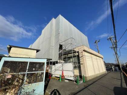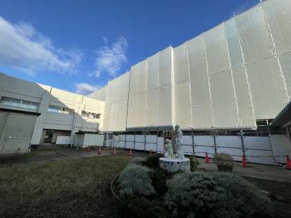 北舎外装工事の準備が進んでいます。周囲の足場が組まれたあと、南と東の壁は、一階部分は板状のもの、その他の階は布状のもので覆われました。別の建物のように見えますね。