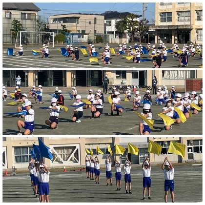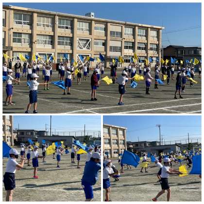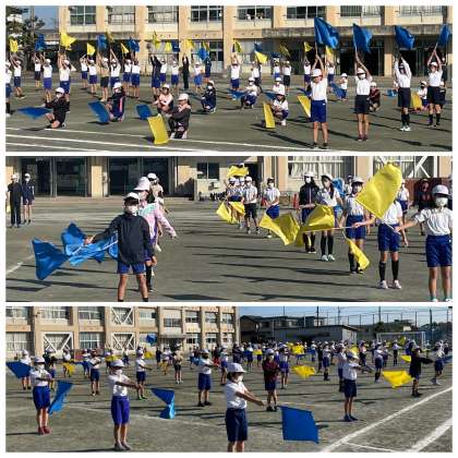 5年生の学年体育の授業のようすです。今日は明日のスポーツ大会に向けた最終練習で、4年生の子らに旗の表現の演技を披露することになっていました。がんばって練習してきたとおりの力強く、みんながしなやかにそろった表現ができましたね。4年生のよい目標になったと思います。明日の本番もすばらしい演技を期待しています。