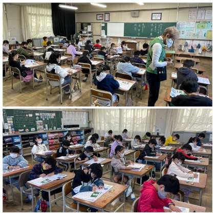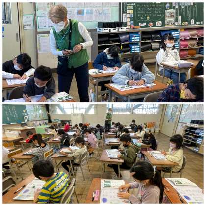 2年生の書写の授業のようすです。「文字の中心に気をつけて書こう」というめあてで学習を進めていました。漢字の中のどの部分が中心になっているか意識して書くことができましたね。