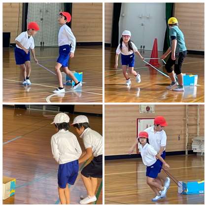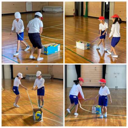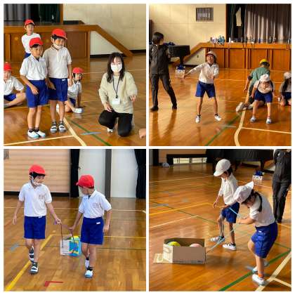ひまわり組の体育の授業のようすです。明日のスポーツ大会に向けて、競技の進め方の確認や練習に取り組んでいました。上手にボールを運んだり、協力して競技に取り組んだりする姿に感心しました。明日もきっと笑顔がたくさん広がりますね。