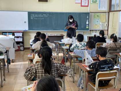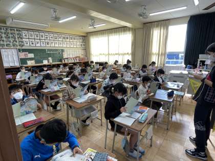 4年生の社会の授業のようすです。大地震が起きたときに備えて、緊急地震速報のしくみについて学んでいました。
