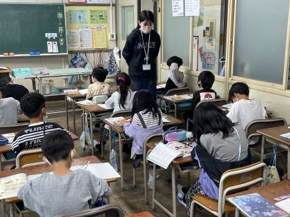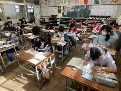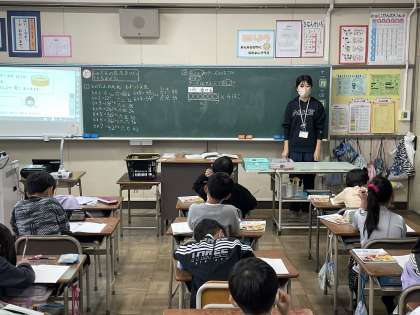 2年生の算数の授業のようすです。「6のだんの九九をつくってとなえよう」というめあてで学習を進めていました。かける数が1増えると、答えは6つずつ増えていくことを確認して唱えることができましたね。