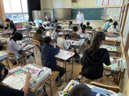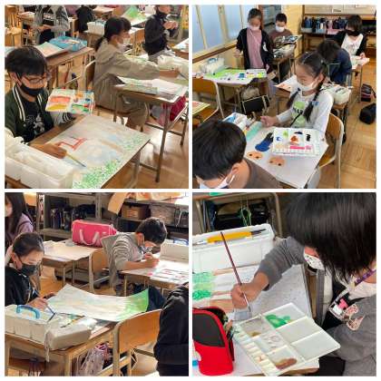 11月15日(火) 読書感想画【4年図工】 公開日 2022/11/15 更新日 2022/11/15 4年 4年生の図工の授業のようすです。読書感想画の作品作りに取り組んでいました。本から感じたイメージを紙面に表現できるようにがんばっていましたね。
