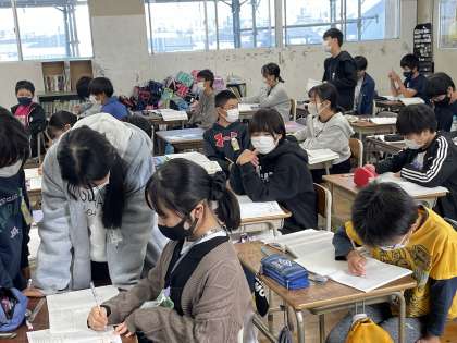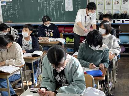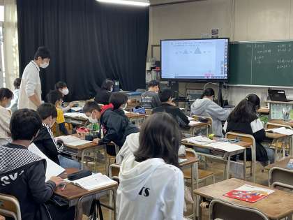 6年生の算数の授業のようすです。1辺がcmの正三角形のまわりの長さをycmとして、xとyの関係はどのようになっているか、式やグラフに表して考えていました。