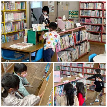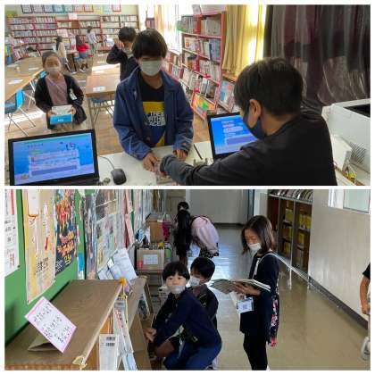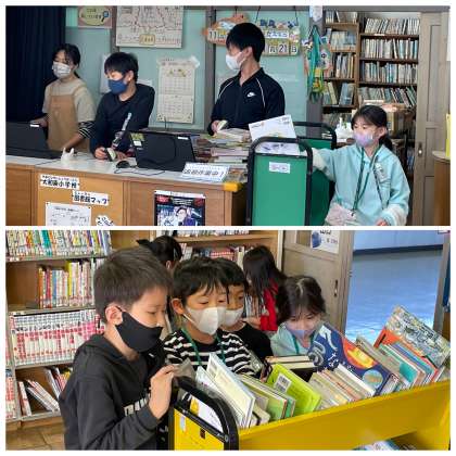 長放課の図書館のようすです。本を借りるためにおおぜいの東っ子が来館し、図書委員さんから貸し出しの手続きをしてもらっていました。楽しい本、興味深い本がたくさんありますね。図書館でたくさんの本に出会って、心に栄養をいっぱいあげましょう!