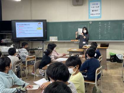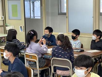 5年生の国語の授業のようすです。「よく話し合うための練習をしよう」というめあてで学習を進めていました。「考えを出し合う話し合い」と「考えをまとめる話し合い」のポイントを確認して練習しました。