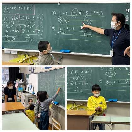 1年生の算数の授業のようすです。「11−6」のようなひきざんの計算の仕方について、手順を説明しながら計算する練習に取り組んでいました。どんな数字になってもしっかりと説明することができて感心しました。