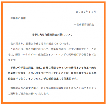 11月16日(水) 冬季に向けた感染症対策について【一宮市教育委員会】 公開日 2022/11/16 更新日 2022/11/16 校長室便り このことについて、一宮市教育委員会より保護者向けのお知らせがきましたので、配付文書に掲載するとともにウェブ記事で紹介いたします。 本格的な冬の到来に備えて、お子様やご家族が健康な生活を送ることができるように、ご理解とご協力をお願いいたします。