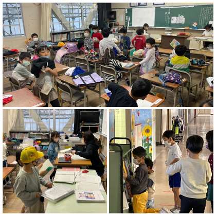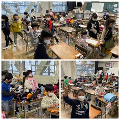 朝の1年生の教室のようすです。明るい元気なあいさつで迎えてくれました。今日も友だちと一緒にたくさんの経験をして、笑顔の花を教室いっぱいにさかせましょうね。