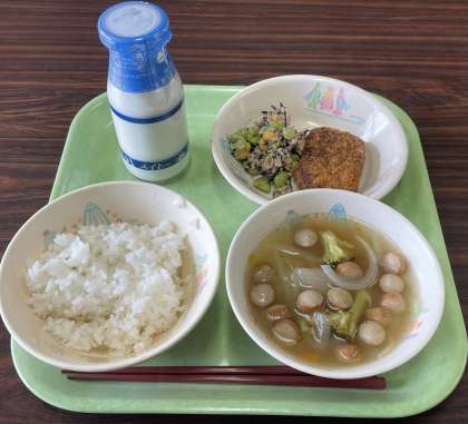 11月17日(木) 今日もおいしくいただきま〜す! 公開日 2022/11/17 更新日 2022/11/17 ひがしっ子ライフ ごはん、ぎゅうにゅう、コンソメスープ、ミンチカツ、ひじきとえだまめのサラダ 今日のコンソメスープには、ブロッコリーが入っています。ブロッコリーは、キャベツの仲間で、小さなつぼみのかたまりと茎の部分を食べます。味や香りにくせがなく、ほのかな甘味があり、さまざまな料理に使えます。にんじんと同じ緑黄色野菜です。