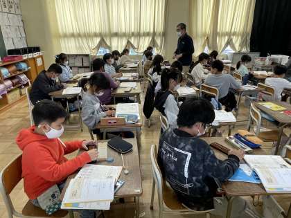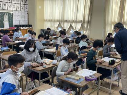 4年生の算数の授業のようすです。そろばんは、日本だけでなく、世界中の国々で学ばれています。今日は定位点のあるけたを一の位として、小数の表し方を学んでいました。
