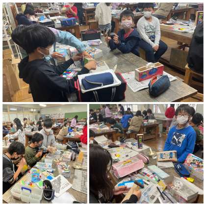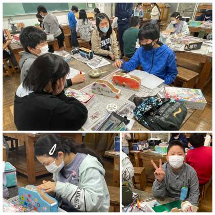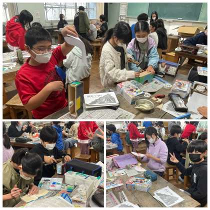 6年生の図工の授業のようすです。テープカッターがいよいよ完成しました。カラフルな色合いのとても素敵な作品に仕上がりましたね。
