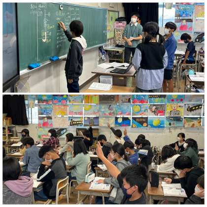 6年生の理科の授業のようすです。「てこのはたらきについて、学んだことを確かめよう」というめあてで学習を進めていました。くぎぬきがどのような原理で簡単にくぎを抜くことができるのか、支点、力点、作用点の3つのことばを使って説明することができましたね。
