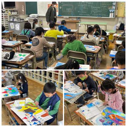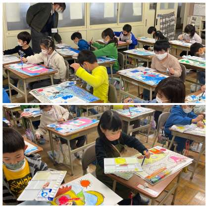 2月3日(金) はいけいをぬろう【1年図工】 公開日 2023/02/03 更新日 2023/02/03 1年 1年生の昨日の図工の授業のようすです。「えのぐをつかってはいけいをぬろう」というめあてで学習を進めていました。描きたかったものが目立つように、背景の色を考えてぬることができましたね。