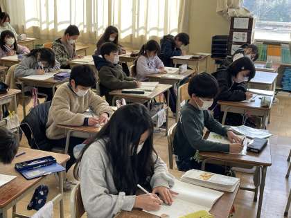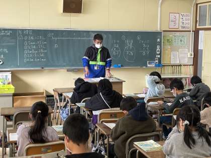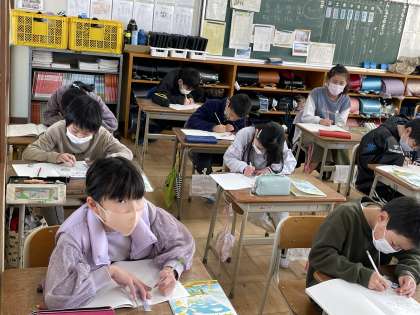 3年生の算数の授業のようすです。長さやかさの単位の変換や小数の筆算のひき算など、3年生で学んだことを確認する練習問題に挑戦していました。