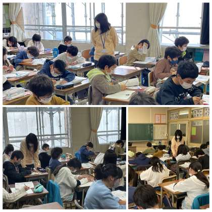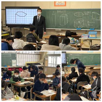 5年生の算数の授業のようすです。「角柱や円柱の見取り図をかこう」というめあてで学習を進めていました。かき方のポイントを先生から教わって、定規をつかって丁寧に線を引くことができましたね。