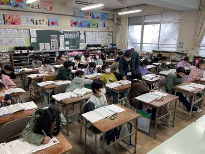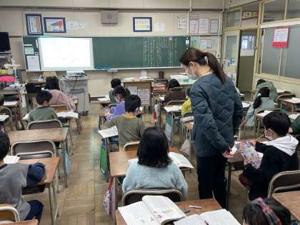 2年生の国語の授業のようすです。「第6場面を読み取ろう」というめあてで学習を進めていました。つなぎの言葉に注目して読み進め、「だれもが『楽しかった』と思えるようにおにごっこができるといい」という筆者の願いを読み取ることができましたね。