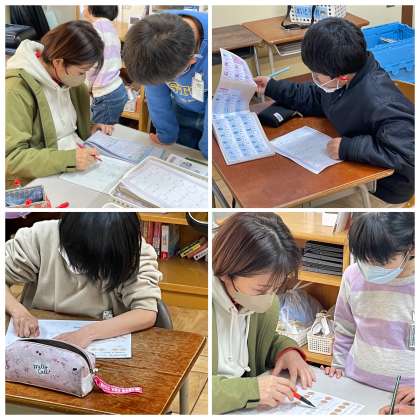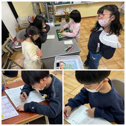 ひまわり組さんの午前の授業のようすです。計算練習や漢字の書き取り、言葉の学習などに一生懸命取り組んでいました。ていねいに粘り強くがんばりましたね。