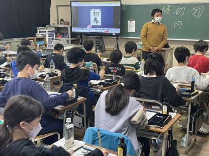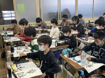 5年生の書写の授業のようすです。「初春」の文字を毛筆で書きました。横の線のバランスや過度のつけ方などに気をつけて、ていねいに筆を運んでました。