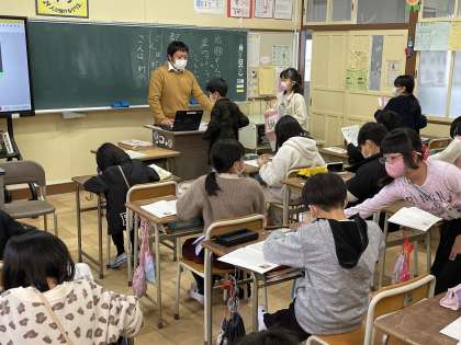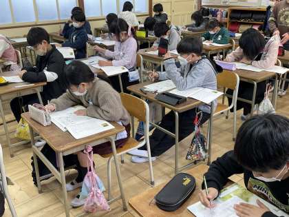 4年生の昨日の書写の授業のようすです。「文字の大きさや配列に気をつけて書こう」というめあてで学習を進めていました。新美南吉のごんぎつねの一部をていねいに書写することができましたね。