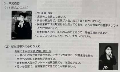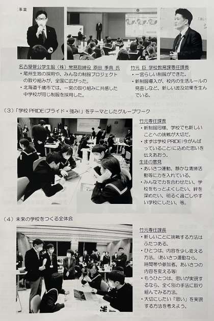 この事業は、「中学校における新制服導入を総括し、令和にふさわしい学校づくりに生かす」「在籍校の強みを生徒自ら見つけることを通じて、課題を発見する力を育てる」「協働的な学びの場を提供することで、互いに刺激し合い高め合う生徒を育てる」ことをねらいに行われています。