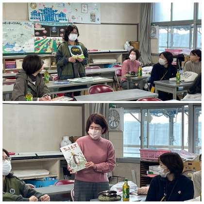 読み聞かせボランティアさんの活動のようすです。各教室で子どもたちに読み聞かせを行った後、今日読んだ本への思いや内容についての情報交換を行ってみえました。