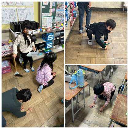 教室をのぞくと、たくさんの子が消しゴムで床をゴシゴシしています。「どうしたの?」と尋ねると「床に赤い線があるので、みんなで消していたんですよ」と教えてくれました。どうやら赤鉛筆の芯が落ちていて、それがこすれていろんなところに赤線が広がってしまったようです。「次に使う子のためにきれいにしないと!」と次の2年生のためにみんなでがんばって消してくれていたようです。やさしさに心があたたかくなりました。今日の大掃除と油引きも、このやさしい気持ちでがんばろうね。