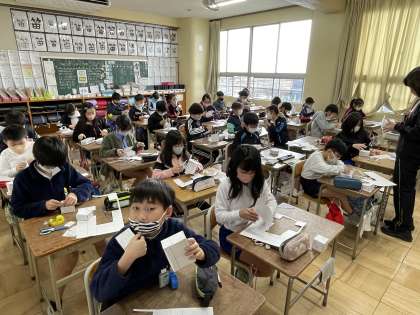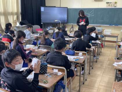 4年生の算数の授業のようすです。展開図を作って、大小2つの直方体を組み立てていました。直方体の特徴を実際に手に取って組み立てたり開いたりして触りながら確認することができましたね。