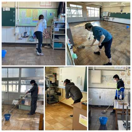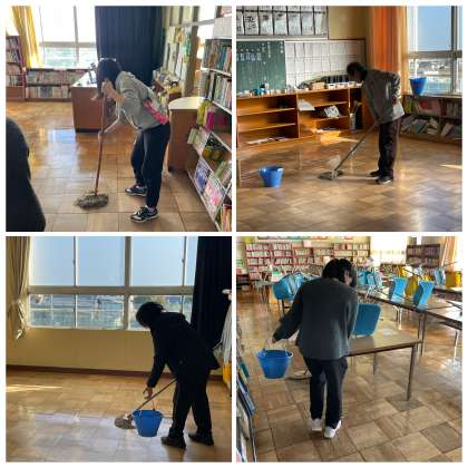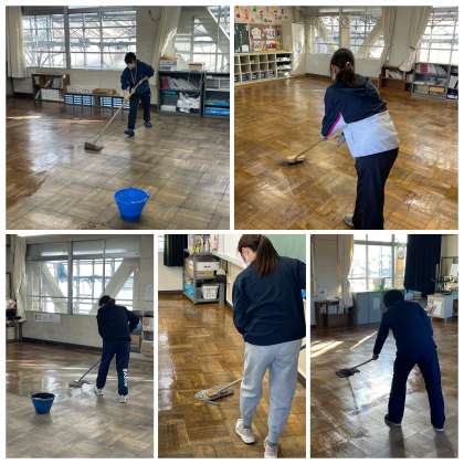 みんなが下校した後、先生たちが教室や特別教室のワックスがけをしてくれていました。たいへんでしたが、みんなの笑顔を思いうかべながらがんばってくれていましたよ!後ろ姿でもどの先生の写真かわかるかな?