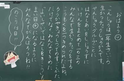 3月6日(月) みんなできめためあて【1年黒板メッセージ】