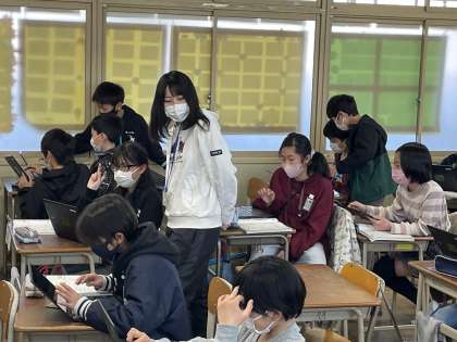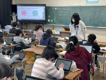 5年生の算数の授業のようすです。「図形をかくプログラムを作ろう」というめあてで学習を進めていました。辺の長さが3cmの正方形を作るにはどんな指示をプログラムすればよいか考え、それをいろんな図形を描くのに応用できるようがんばっていました。