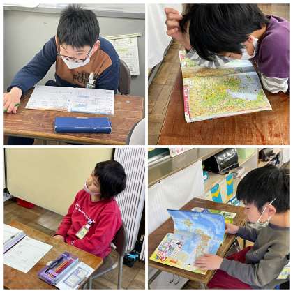 3月6日(月) じっくりと【ひまわり組】 公開日 2023/03/06 更新日 2023/03/06 ひまわり組 ひまわり組さんの授業のようすです。地図帳調べや算数の計算など、自分のめあてが達成できるようにじっくりと取り組みました。落ち着いて粘り強くがんばることができましたね。