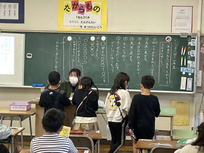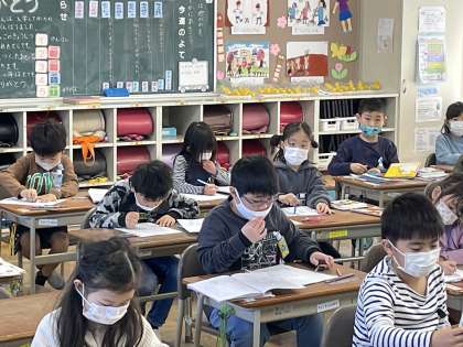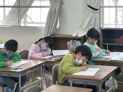 1年生の国語の授業のようすです。「1年生のおもい出をくわしくえにっきにかこう」というめあてで学習を進めていました。行事でがんばったことや感じたことを絵と文でていねいに表現していきました。