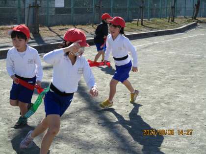 体育で「しっぽ取りゲーム」をしました。気持ちの良い気候の中、みんな真剣に走り回り楽しそうでした。そのあと行った「転がしドッジ」には先生3人も参戦して白熱しました。