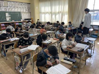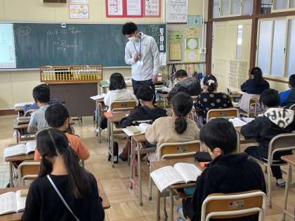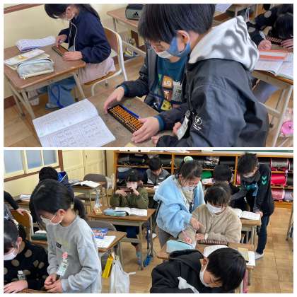 3年生の算数の授業のようすです。「92−35」や「73−14」の計算をそろばんで求める練習に挑戦していました。十の位や一の位の計算をどうするか考えて、玉を動かすことができましたね。