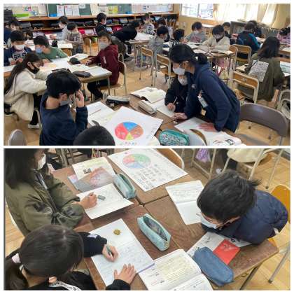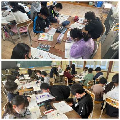 3月7日(火) 発表の準備【4年国語】 公開日 2023/03/07 更新日 2023/03/07 4年 4年生の国語の授業のようすです。「アンケート結果を整理し、資料を作って発表しよう」というめあてで学習を進めていました。班で相談して発表の原稿ができつつあります。どんな発表になるか楽しみですね。