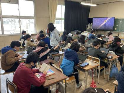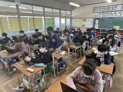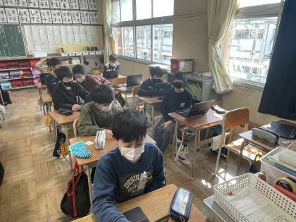 5年生の算数の授業のようすです。いろいろな指示を考えてプログラミングし、星型や多角形、図形の重なりからできる模様などの作図をしていました。