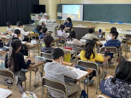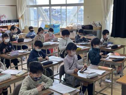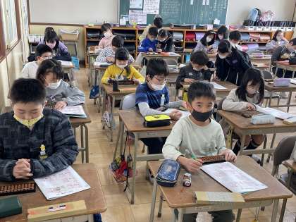 3年生の算数の授業のようすです。「そろばんの玉の動かしかたを知ろう」というめあてで、簡単な計算に挑戦していました。指の使い方をしっかりと確認することができましたね。