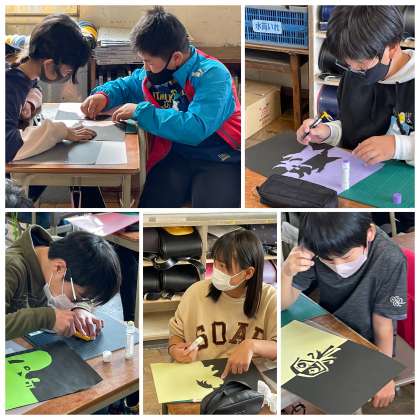 5年生の図工の授業のようすです。紙工作で「ネガポジの世界を表す作品を作ろう」というめあてで学習を進めていました。左右や上下で反転する作品をどう表現しようか、イメージをふくらませながら、楽しく作品づくりを進めていました。