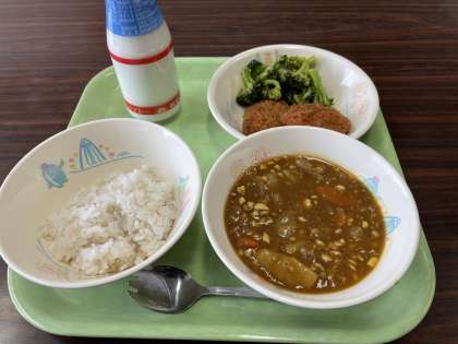 むぎごはん、ぎゅうにゅう、カレーシチュー、ヒレカツ、ブロッコリーのドレッシングあえ