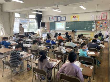 1年生の算数の授業のようすです。「おかしがかえるかかえないかをかんがえよう」というめあてで学習を進めていました。「安い」をキーワードにして、買えるか買えないかの理由も合わせて言えるように考えを深めていきました。