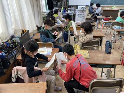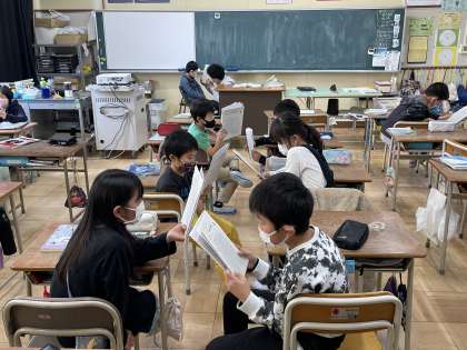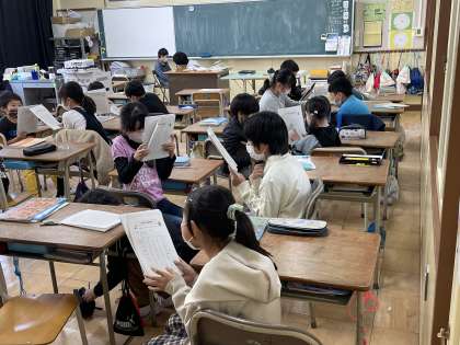 3年生の算数の授業のようすです。「1分間にどれだけできるか挑戦しよう」という目標で、ペアになって分数の計算問題に挑戦していました。応援してもらいながら、1問でも多く解けるようにがんばっていましたね。