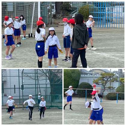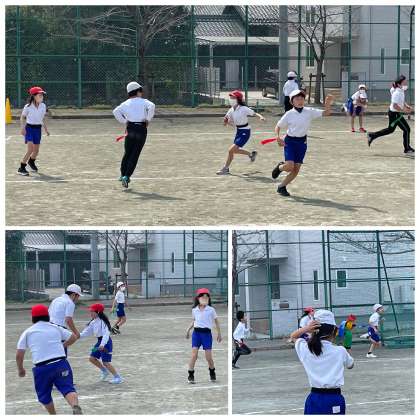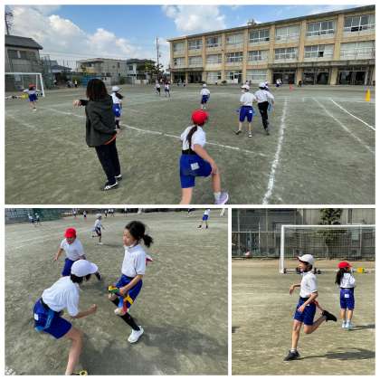 遠くの方から声をかけてくれたので、近づいて4年生の体育の授業を参観させてもらいました。ひもを2つ体につけて行うタグラグビーに挑戦していました。すごいステップで周りの手から逃げ切る子がたくさんいて驚きました。最後はみんなで協力して囲みました。協力するとすごい力になることもわかりましたね。