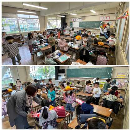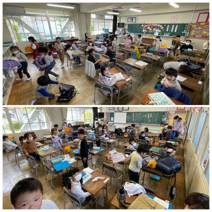 1年生の朝の教室のようすです。朝の会の前までにどんなことをするのか、先生に教えてもらいながら準備の勉強です。自分でできることが増えていきますね。写真は上から1組2組3組4組の順です。