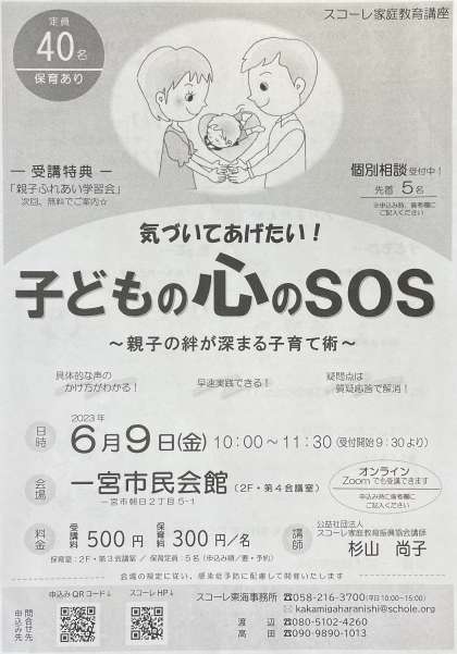 地域の方より家庭教育講座「気づいてあげたい!子どもの心のSOS〜親子の絆が深まる子育て術〜」の紹介とチラシ配布の依頼を受けましたのでウェブ記事で紹介します。この講座は、一宮市教育委員会の後援を受けています。チラシは、配付物削減の学校方針から各家庭への配布は行わず、ウェブ紹介のみとします。