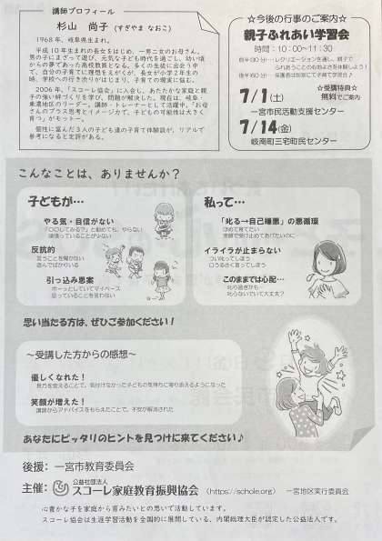 心豊かな子を家庭から育みたいという願いを込めて活動してみえるそうです。興味がある方や裏面の子どものようすに心当たりのある方は、各自で申し込みをお願いします。