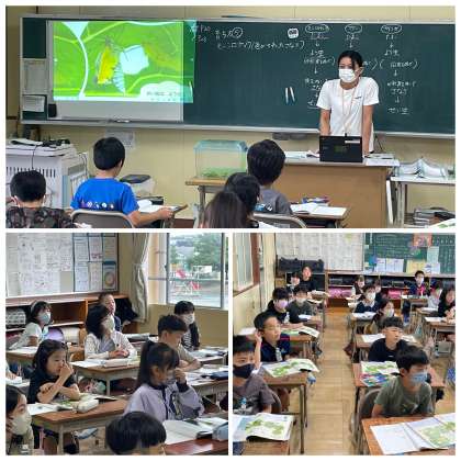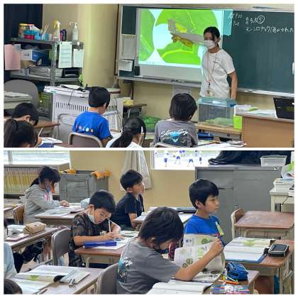 3年生の理科の授業のようすです。モンシロチョウの成長のようすについて学習をしていました。チョウは、たまごからよう虫になり、くりかえし皮をぬいで大きくなることや、やがてさなぎになり、さなぎの中で新しい体にかわって、さなぎから出てせい虫になることがわかりましたね。