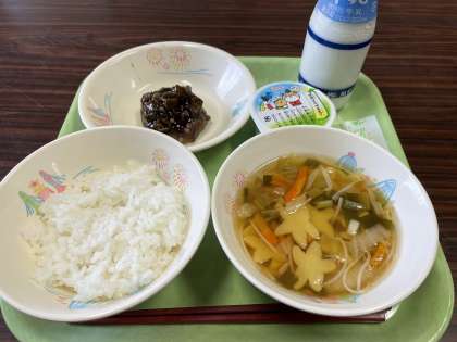 ごはん、ぎゅうにゅう、ハンバーグのオクラソースがけ、たなばたじる、たなばたデザート
