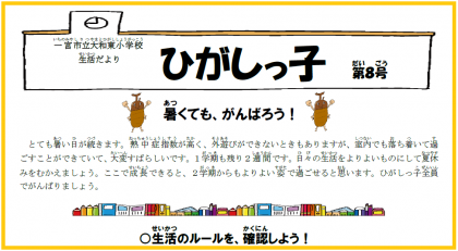 本日、生活だより「ひがしっ子第8号」を配付します。1学期の残り2週間にどんなことに心がけて生活できるとよいか、確認する内容になっています。ご家庭からも応援をよろしくお願いいたします。