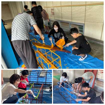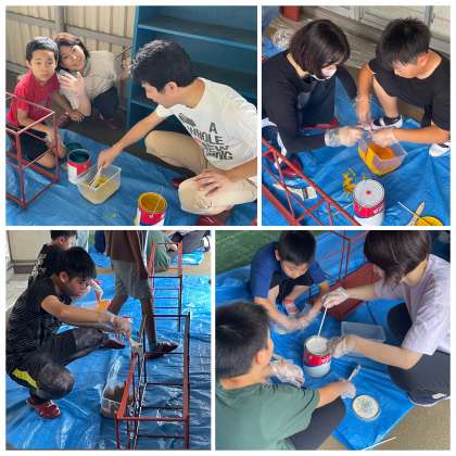 今日の活動は、前回に続いて体育館の南廊下で傘立ての修繕をしていただきました。さびてしまっていたので、みがいてサビ止めをぬったところに、新たにペンキを塗っていただきました。この後、傘を出し入れしやすいように仕切りのひもをはっていただく予定です。